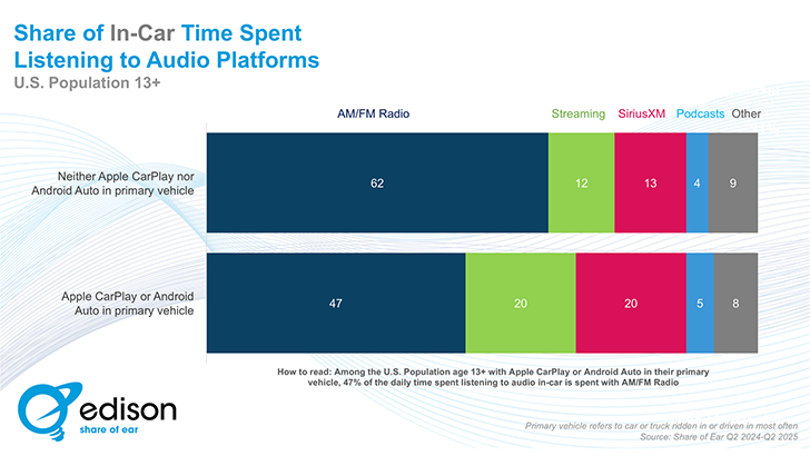 Edison: Despite CarPlay And Android In The Car, Radio Still Retains 47% Of Time Spent Listening JOCKLINE, SEPTEMBER 11TH, 2025 – In Edison's latest 'Insights,' it says Americans 13+ spend most of their daily in-car audio time listening to AM/FM radio, especially those who do not have Apple CarPlay or Android Auto in their primary vehicle. Radio continues to dominate in-car audio listening across many different audience segments, but the presence of Apple CarPlay or Android Auto does weaken the platform’s dominance while driving. In-car audio listening has transformed significantly since Apple CarPlay and Android Auto have made their way into more and more vehicles. As of Q2 2025, just over one-third of Americans 13+ have Apple CarPlay or Android Auto in their primary vehicle. Not only is the presence of these technologies in vehicles becoming more popular, but they are also becoming more ingrained in consumer's daily audio habits. Recently, we published that 83% of Americans 18+ who have access to Apple CarPlay or Android Auto, use either technology. While radio's share is lower among those with these new technologies in their cars, it still garners the most time spent listening at 47%. As the graph shows, the biggest platform gainers among those who have CarPlay or Android Auto are Streaming Audio and SiriusXM Radio, both accounting for 20% of in-car audio time respectively. Another surprising element of this graph is the percentage of time spent listening to podcasts among both audiences. While more time is spent with other digital platforms once someone has Apple CarPlay or Android Auto, time spent with podcasts remains relatively modest and stable. Visit our website to find out more about Share of Ear® and the other flagship research products.