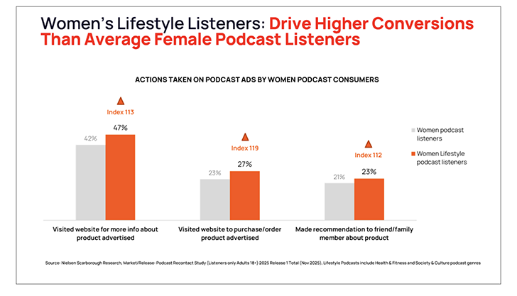 JOCKLINE, APRIL 8TH, 2026 – While social media overflows with celebrities promoting products and polished lifestyles, many women are turning instead to a more trusted source for advice: expert-led lifestyle podcasts. From finance and relationships to fitness, true crime, and pop culture, these shows hosted by credentialed doctors, financial advisors, athletes, and entrepreneurs are cultivating fiercely loyal female audiences who don’t just listen. They act. According to Audacy’s Power of Influencers Study 2025, 47% of these listeners visited a website for more information, 27% made a purchase, and 23% recommended brands to others—rates that significantly outperform general female podcast audiences. Reis-Dennis adds, “We live in an age where we are inundated by information from all sides and it’s hard to know who to trust. Having someone who is credentialed and earns your trust week after week is priceless. Women want to hear from someone who is relatable and isn’t judging them.” Read full report HERE