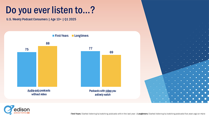 Edison: Video Content Is More Important Than Ever For Engaging With New Podcast Audiences THE MOUTH, AUGUST 28TH, 2025 - It’s no secret that video podcasts have significantly disrupted the podcast industry. Data from Edison Research’s Infinite Dial™ and Edison Podcast Metrics™ show the importance of video content and platforms in engaging current and future listeners. Just last week, Edison Research’s Senior Director Gabriel Soto showcased yet more new data at Podcast Movement 2025 illustrating how essential video content and platforms are in engaging new audiences. Soto’s presentation aimed to spark conversations about the future of podcasting by examining the habits of two groups: the newest podcast consumers, whom we called “First-Years,” who started listening within the last year; and those labeled “Longtimers,” those who have been listening to the medium for five or more years. Using new data from Edison Podcast Metrics, we can compare podcast consumption among these two groups, looking at how many consume audio-only podcasts versus podcasts with video that is actively watched. n short, most new consumers and established podcast fans are actively watching while listening to video podcasts. One key finding from Soto’s presentation is that video is even more important for engaging with new audiences. A higher percentage of First-Years actively watch while they listen to video podcasts compared to those who engage with audio only podcasts, 77% vs 75%. Long-timers continue to have an affinity for audio only podcasts, but this may change over time. Podcasting remains an audio-first platform, with many describing podcasts as something you can listen to and understand with your eyes closed. At the same time, many creators and marketers are likely missing an audience acquisition and engagement opportunity by not considering how to fit video content and video platforms into their strategic planning.