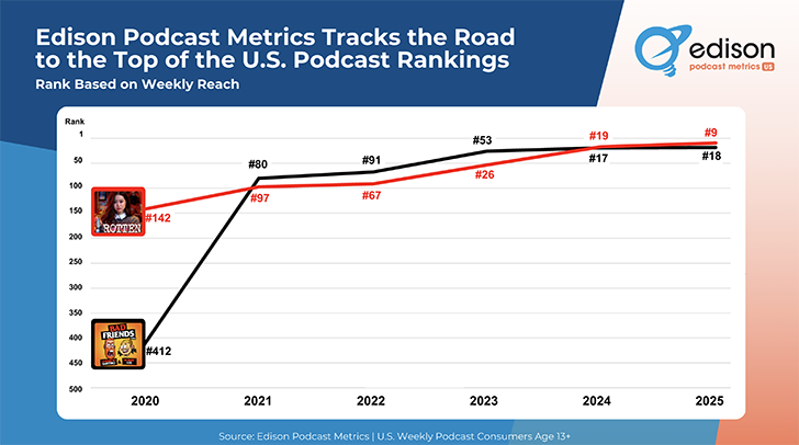 Edison: Two Podcasts That Have Gained Significant Ground In Podcast Rankings Since 2020 In The U.S. THE MOUTH, SEPTEMBER 4TH, 2025 - In this week's Edison Insights it focuses on its Edison Podcast Metrics and follows the rise of two podcasts through the rankings. This research provides access to a sample of over 20,000 U.S. weekly podcast listeners 13+ each year, capturing audience demographics, content preferences, and listening behaviors. In this week's insights, it highlights two podcasts that have gained significant ground on Edison’s U.S. Top Podcasts list: Rotten Mango and Bad Friends. Since 2020 Rotten Mango has grown to be the podcast with the 9th largest weekly U.S. listening audience, up significantly from having ranked 142nd in 2020. Bad Friends has made an even larger jump, moving from 412th in 2020 to 18th in 2025. There are several possible factors that have helped propel both shows higher on our list. Rotten Mango was signed to SiriusXM in early 2025 and conducted extensive and detailed reporting directly from the trial of music mogul, Sean “P. Diddy” Combs. Bad Friends has capitalized on several episodes “going viral”, which has helped the show gain audience traction. Both shows have also leaned into YouTube, publishing video versions of their shows directly on the platform These two case studies represent just a small example of how Edison Podcast Metrics can be used to deeply understand the U.S. podcast audience over time. Subscribe to Weekly Insights to stay connected to trends and insights in the entire audio space and visit our website to learn more about a subscription to Edison Podcast Metrics.