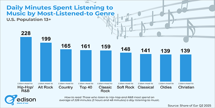 Edison: Hip-Hop/R&B Fans Spend The Most Daily Time Listening To Music Among Americans 13+ THE MOUTH, AUGUST 21ST, 2025 - In this week's 'Insights' from Edison, they share that in total, it's 'Share of Ear' study captures 2 hours and 50 minutes of music listening a day among Americans 13+. But, for the first time ever, we are now releasing how time spent with music varies by what genre a person tells us they listen to most. As of Q2 2025, those who tell us Hip-Hop/R&B is the kind of music they listen to most often spend the greatest amount of time with music in a day: 3 hours and 48 minutes. This is almost one full hour higher than the total audience. Alternative Rock fans are in second place, with this group spending approximately 3 hours and 19 minutes with music per day. Americans 13+ who listen to Oldies or Christian music spend the least daily time with music. The graph above shows daily music minutes across different genres, all available from Share of Ear. This week’s insight focuses purely on time spent with music by genre, but a full subscription also provides access to time spent listening to other types of audio content, in various locations, and on different devices. Visit our website or inquire here to learn all about the nuanced data available via a Share of Ear subscription.