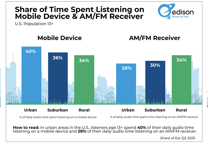 EDISON: Radio Receivers Strongest In Rural Areas, Mobile Devices Dominant In Urban Communities JOCKLINE, SEPTEMBER 25TH, 2025 – Edison Research’s Share of Ear study goes in-depth on all the ways Americans engage with audio daily. This weekly insight focuses specifically on which devices Americans use to listen to audio daily in Q2 of 2025, and investigates how that varies depending on what type of community someone lives in. While Share of Ear captures many different types of audio listening devices, today we will focus specifically on the top two: mobile device and AM/FM radio receiver. Among all Americans 13+, 38% of time is spent listening to audio on a mobile device, such as a smartphone or tablet, and 30% of time is spent listening to audio on an AM/FM radio receiver. Share of Ear showed that the mobile device surpassed the AM/FM radio receiver back in Q3 of 2022. While the mobile device remains the most popular audio listening device, the competition between the two gets tighter as you look at different community types across the United States. The popularity of mobile devices for audio listening is the most dominant in urban communities. Within that audience segment, 40% of time is spent listening to audio on a mobile device, vs. 28% of time spent listening on an AM/FM radio receiver. The mobile device also holds a strong lead in suburban communities, with 36% of time spent listening on that device compared to 30% of time on a radio receiver. The radio receiver is strongest in rural communities where it matches the listening time of the mobile device, each receiving 34%. Find out more about a Share of Ear subscription HERE.