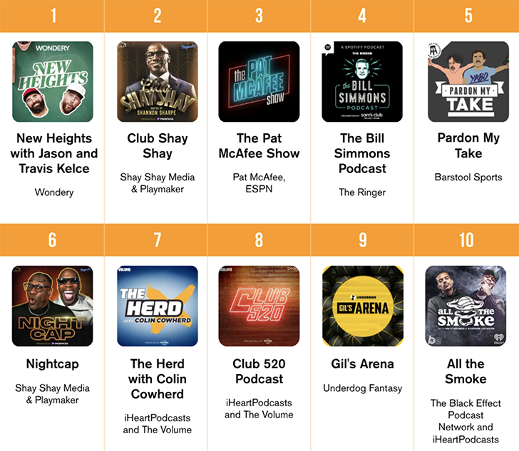 The rest of the top 10 (shown below) include The Joe Rogan Experience Crime Junkie, The Daily, Call Her Daddy, Smartless, Stuff You Should Know, Dateline NBC (+2 rank positions since Q4 2025) This Past Weekend with Theo Von, MrBallen Podcast: Strange, Dark & Mysterious Stories (+8 rank positions since Q4 2025), New Heights with Jason & Travis Kelce. After winning the inaugural Golden Globe for Best Podcast in January 2026, Good Hang with Amy Poehler soars from 38th to 13th in one quarter, marking the second consecutive quarter the show has reached a record high. Other Golden Globe Best Podcast finalists that moved up the ranker: The Mel Robbins Podcast (+3), Up First(+1), and Armchair Expert (+12). Notable Moves: The Giggly Squad breaks into the top 50 for the first time. It won Best Podcast of the Year at the iHeart Podcast Awards in March 2026. The Herd with Colin Cowherd hits a record high.Cowherd received criticism after launching an AI version of himself. The Dan Bongino Show re-enters the top 50. Joe and Jada reach 57th after climbing the ranks consistently since debuting in May 2025. See full list HERE